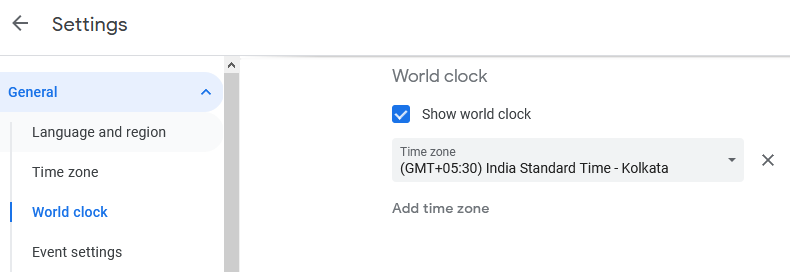 Go to Settings > Time Zone to add your preferred and secondary time zones. Just below Time, you’ll find an option to enable World clock to show on the left side of the Calendar.