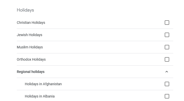 Same as adding a new calendar, just go browse calendars of interest and you’ll get a list of calendars that you can import from Jewish/Christian/Muslim/Orthodox holidays to a country-specific list of holidays.