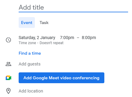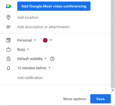 Video conferencing is one sector that has greatly benefited from the pandemic, most of our meetings require some form of video communication in remote work. Any event that you add can be easily patched with a Google Meet/Hangout video conference.