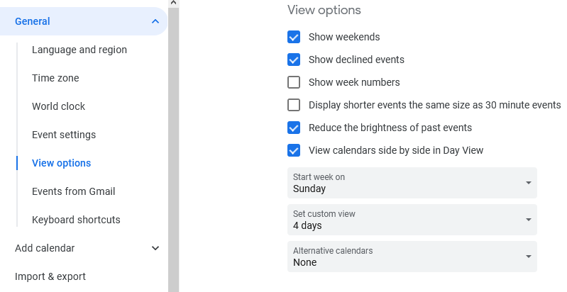 Google Calendar gives you multiple options for its view, you can easily switch the view from day to week to month to year. There are options for showcasing weekends and declined events as well. This can be accessed from the tab (Week by default) right next to the Settings icon.